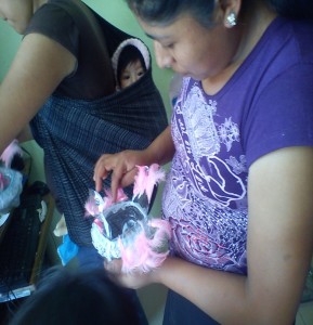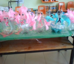 Las madres familia elaboran un patito con las botellas de plástico, como regalo del día del niño, contribuyendo a no seguir contaminando el medio ambiente y dándole al pet un uso productivo (el cual es sacado del contenedor de la escuela).